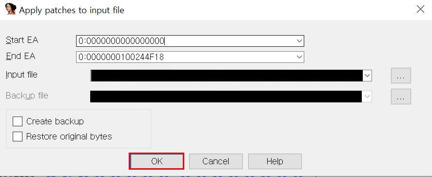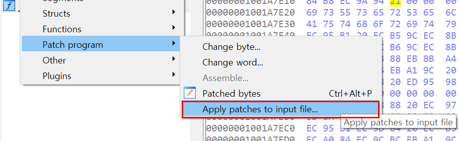 μμ μ΄ λͺ¨λ μλ£λλ©΄ λ§μ°μ€ ν¬μΈν°λ₯Ό μμ λ μμμ κ°μ Έλ€ λμκ³ Edit -> Patch program -> Apply patches to input file ν΄λ¦ν΄μ€λλ€.