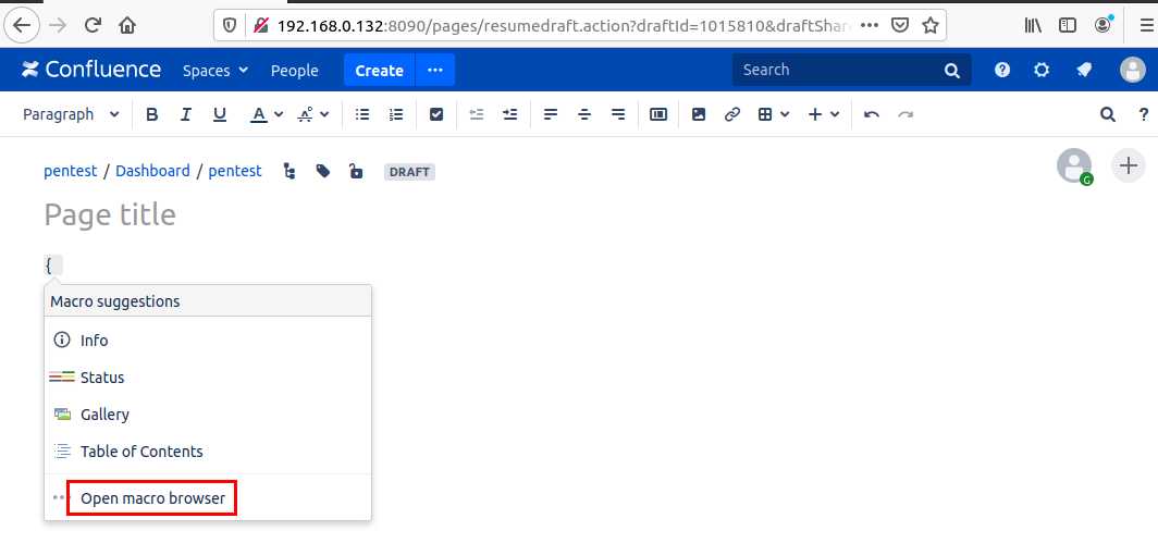 Creatλ₯Ό λλ₯΄λ©΄ νμ΄μ§ λ§λ€κΈ°κ° μμ±λ©λλ€. μ¬κΈ°μ "{"λ₯Ό μ λ ₯ν΄ λ§€ν¬λ‘ κΈ°λ₯μ΄ λνλλλ‘ ν΄μ£Όμκ³ "Open macro browse"λ‘ μ΄λνκ² μ΅λλ€.