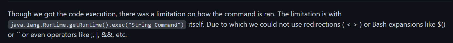 WriteUP λ΄μ©μ μνλ©΄ νμ¬κΉμ§λ μ΄μ€μΌμ΄ν μνμ€μ λ°°μ΄ μ κ·Όμλ₯Ό ν΅ν΄ μ΄λ μ λ νΈμΆμ΄ κ°λ₯νμ§λ§ μΆκ°μ μΌλ‘ 컀맨λλ₯Ό μ€ννλ λ° μ¬μ©λλ κΈ°νΈλ€μ νν°λ§μ΄ μ‘νμμ΄Baisc ν 곡격μ½λλ‘λ isSafeExpressionμ μ‘νκ³ λ§λ€λ λ΄μ©μ΄ μμ΅λλ€.