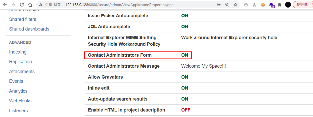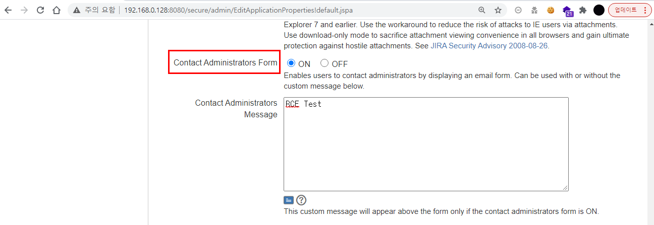 μ·¨μ½μ ν μ€νΈλ₯Ό μν΄ "νμ±ν"λ‘ μ€μ νκ³ μ§ννκ² μ΅λλ€. κΈ°λ³Έμ μΌλ‘ Contact Administrators Formμ΄λΌλ κ΄λ¦¬μ μ°λ½ μμμ "λΉνμ±ν"λ μνλ‘ λμ΄ μμ΅λλ€. ν΄λΉ κΈ°λ₯μ΄ νμ±νλ κ²½μ° velocity κΈ°λ°μ ν νλ¦Ώμ΄ λ‘κ·ΈμΈλμ§ μμ μ¬μ©μλ€μκ²λ μ 곡λκ² λ©λλ€.
