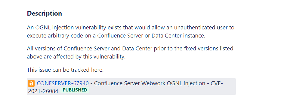 μν₯μ λ°λ λ²μ μ Confluence Server λ° Data Centerμλ μΈμ¦λ μ¬μ©μμ κ²½μ°μ λ°λΌ μΈμ¦λμ§ μμ μ¬μ©μκ° Confluenceλλ Data Center μΈμ€ν΄μ€μμ html νλλ₯Ό λμμΌλ‘ μμμ μ½λλ₯Ό μ€νν μ μλ OGNL μΈμ μ μ ν μ μμ΅λλ€.