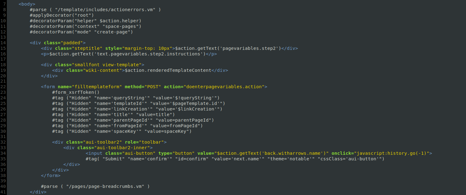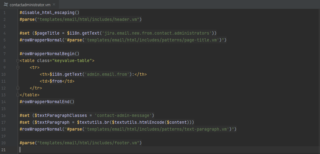 μ½μ λλ μ½λμ ννλ μ΄λ€ ν νλ¦Ώ μμ§μ μ°λμ λ°λΌ μ‘°κΈμ© λ¬λΌμ§λλ€. Jira Softwareλ Apache Velocity ν νλ¦Ώ μμ§μ ν΅ν΄ μ¬μ©μλ€μκ² μ΄λ©μΌ μ μ‘κ³Ό κ΄λ ¨λ ν νλ¦Ώμ λ λλ§ ν©λλ€. HTML μ½ν μΈ μ ν¨κ» JAVAκΈ°λ₯μ νΈμΆνκ³ κ°μ²΄λ₯Ό μ¬μ©ν μ μμ΅λλ€.