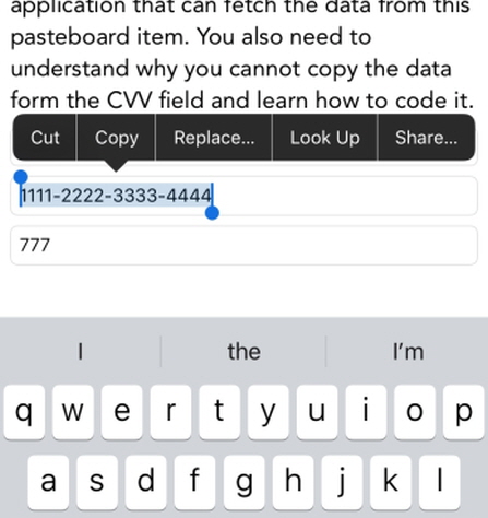 ์ทจ์ฝํ ์ฑ ์ ํ๋ฆฌ์ผ์ด์ ์ ๋์์ผ๋ก ํ ์คํธ๋ฅผ ์งํํด๋ณด๊ฒ ์ต๋๋ค. ๊ฐ์ด ๋ค์ด๊ฐ๋ ๋ถ๋ถ์ด ๊ณ์ข๋ฒํธํ CVC ๋๋ฒ๋ง์ ๋ฐ๋ ํ์ด์ง์์ "Copy"๋ฅผ ์ ํํฉ๋๋ค.