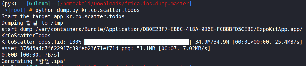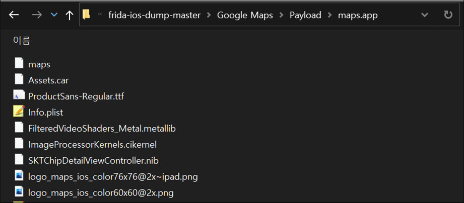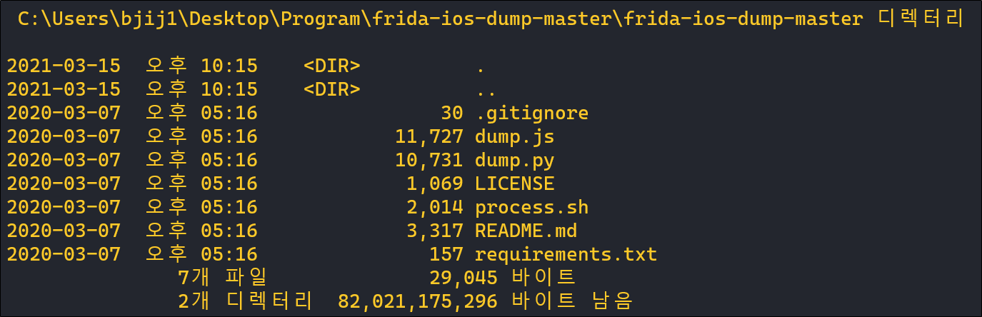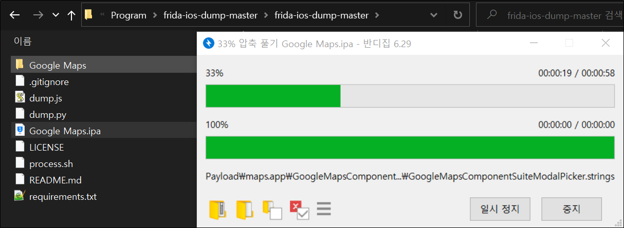 FairPlay DRM ๋ณตํธํ๊ฐ ์์ ๋ ipaํ์ผ์ ํ์ฌ ๋๋ ํ ๋ฆฌ์ธ frida-ios-dump-master ํด๋ ์์. ipa ํ์ฅ์๋ก ์์ฑ๋ฉ๋๋ค. ์ด์ ํด๋น ํ์ผ์ ์์ถ์ ํด์ ํด๋ณด๊ฒ ์ต๋๋ค.