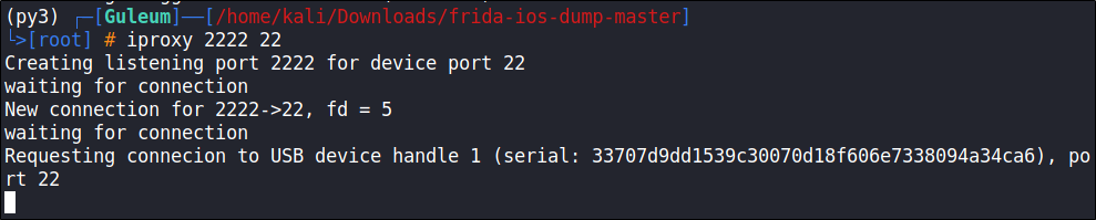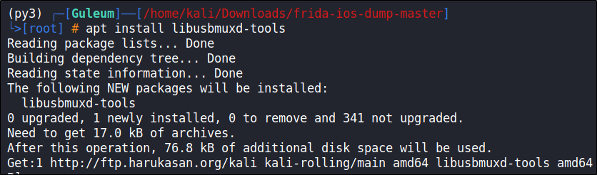 Kali Linux์ iPhone์ด ์ ์์ ์ผ๋ก attaching ๋์๋์ง ํ์ธํ๊ธฐ ์ํด ์ฑ์ ์ค์น๋ ๋ฆฌ์คํธ๋ฅผ ํ์ธํ๋ ๋ช ๋ น์ด๋ฅผ ์ ๋ ฅํด๋ด ๋๋ค.