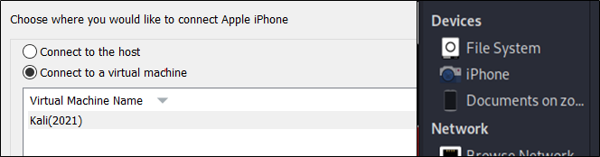 iPHONE ๋จ๋ง์ ์ฐ๊ฒฐํ๋ฉด ์๋์ ๊ฐ์ ํ์ ์ฐฝ์ด ๋ํ๋๋ค. ํ๋จ์ “Connect to a virtual machine”์ผ๋ก ์ ํ ํ ์์ ์ ๊ฐ์ ์ด๋ฏธ์ง์ ์ฐ๊ฒฐ์ํค๋ฉด ๋๋ ํ ๋ฆฌ ๋ฆฌ์คํธ์ “iPhone”์ด ๋ํ๋ฉ๋๋ค.