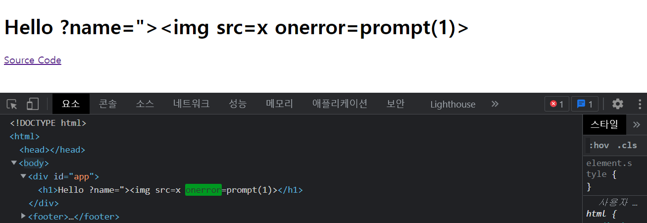 XSSλ₯Ό μ λ°νκΈ°μν΄ μ€ν¬λ¦½νΈ ꡬ문μ μ½μ ν΄λ³΄λ©΄ μ€νλμ§ μμ΅λλ€. name λ³μμ ${escapeHTML}μ μν₯μΌλ‘ μ λ ₯λ νΉμλ¬Έμλ€μ΄ μ΄μ€μΌμ΄ν μ²λ¦¬λκΈ° λλ¬Έμ λλ€.