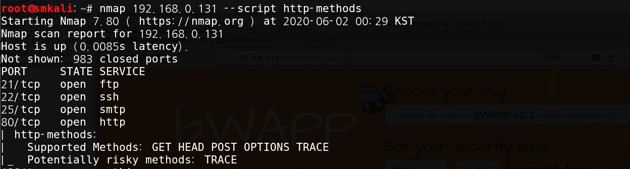 ๋ง์ง๋ง์ผ๋ก nmap์ --scritp http-methods๋ฅผ ํตํด ์ด๋ฆฐ ํฌํธ์ ํ์ฉ์ค์ธ ๋ฉ์๋ ๋ฆฌ์คํธ๋ฅผ ํ์ธํ ์ ์์ต๋๋ค. TRACE ๋ฉ์๋๊ฐ ์กด์ฌํ๋ ์น ํ๋ก์ ๋๊ตฌ๋ก ๋ฉ์๋๋ฅผ ๋ณ๊ฒฝํด์ ์๋ต๊ฐ์ ํ์ธํ๋ฉด ๋ฉ๋๋ค.