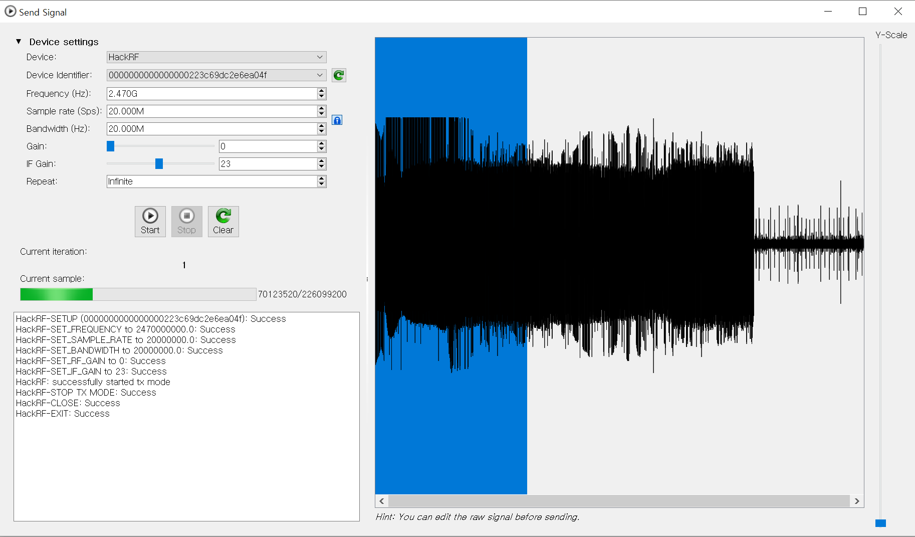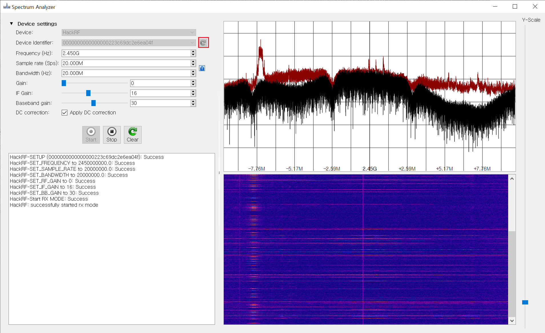 ํ ์คํธ์ ์ฌ์ฉ๋ HackRF one์ด๋ผ๋ ์ด ์ฅ๋น๋ 1 MHz ~ 6 MHz์ ๋ฌด์ ์ ํธ๋ฅผ ๋ฐ์ด ์ค ํต์ (Half Duflex) ํ๊ฒ ๋์์ฃผ๋ ์คํ์์ค ํ๋์จ์ด์ ๋๋ค.