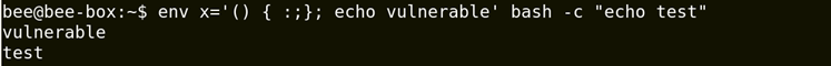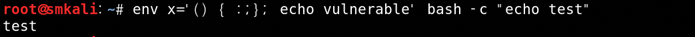 env x='() { :;}; echo vulnerable' bash -c "echo test"