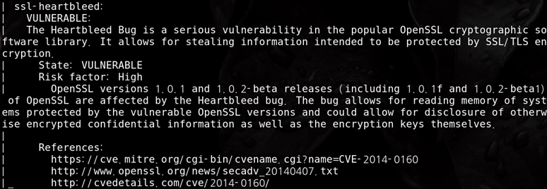 nmap ์ค์บ๋ ๋๊ตฌ๋ฅผ ํตํด Heartbleed ์ทจ์ฝ์ ์ด ์กด์ฌํ๋์ง ํ์ธํ ์ ์์ต๋๋ค. ์ทจ์ฝํ ๊ฒฝ์ฐ State: VULNERABLE ๋ฌธ๊ตฌ์ ํจ๊ป ๋์ ์๋น์ค๊ฐ ์ด๋ ๋ฒ์ ์ ์ฌ์ฉํ๊ณ ์๋์ง๋ ํ์ธ์ด ๊ฐ๋ฅํฉ๋๋ค.