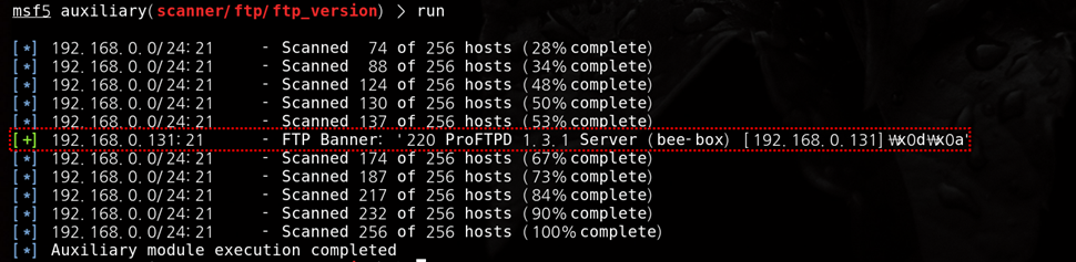 msf5 auxiliary(scanner/ftp/ftp_version) > set RHOSTS 192.168.0.0/24 --> ์ ์ฒด๋์ญ