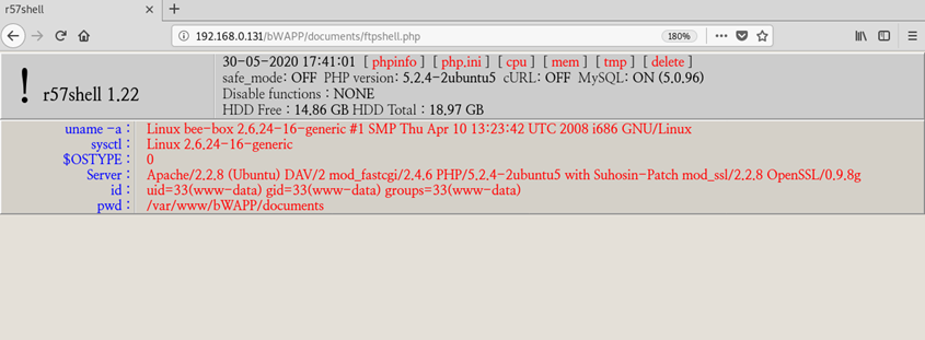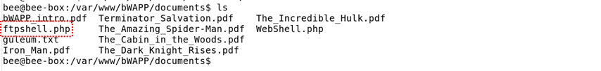 ์น ์๋ฒ ๊ฒฝ๋ก์ธ /var/www ์ bWAPP/documents ์ ftpshell.php ๊ฐ ์ฑ๊ณต์ ์ผ๋ก ์ ๋ก๋๋์ด ์๋์ง ํ์ธํ์ต๋๋ค.