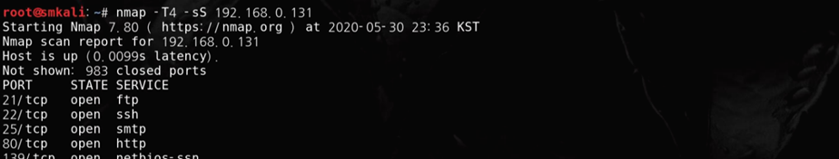 -sS : SYN Scan ( ๋์๊ณผ ์ธ์ ์ ์ฑ๋ฆฝํ์ง ์์ ํ์๋ฅผ ๋ ธ์ถํ ์ฐ๋ ค๊ฐ ์ ์ )