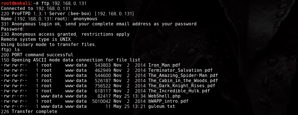 ID : Anonymous / Password : Anonymous๋ฅผ ์ ๋ ฅํ์ฌ ์ต๋ช ๊ณ์ ์ผ๋ก ์ ์ ์๋ฃ๋์์ผ๋ ๋์ ์์คํ ๋ช ๋ น์ด๋ฅผ ํ์ฉํ์ฌ ๋๋ ํฐ๋ฆฌ ๋ชฉ๋ก์ ํ์ธํ ์ ์์ต๋๋ค.