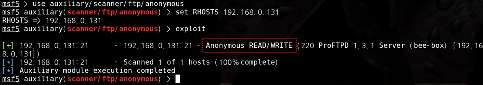 msf5 auxiliary(scanner/ftp/anonymous) > set RHOSTS 192.168.0.131