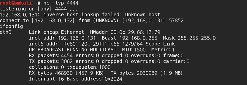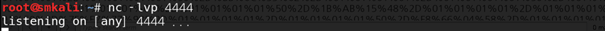 ๊ณต๊ฒฉ ์ํ ํ 4444๋ฒ ํฌํธ๋ก ๋ฆฌ์ค๋ ์ค์ธ ํฐ๋ฏธ๋์ ํ์ธํด๋ณด๋ฉด ์ธ์ ์ด ์ฑ๊ณต์ ์ผ๋ก ํ๋ฆฝ๋ผ์ ๊ณต๊ฒฉ์๊ฐ ๋์ ์์คํ ์ ์ํ๋ ๋ช ๋ น์ด๋ฅผ ์ํํ ์ ์๊ฒ ๋ฉ๋๋ค.