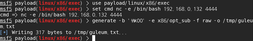 msfvenom -p linux/x86/exec CMD=/bin/ps -b '\x00' -e x86/opt_sub -f raw > guleum.txt